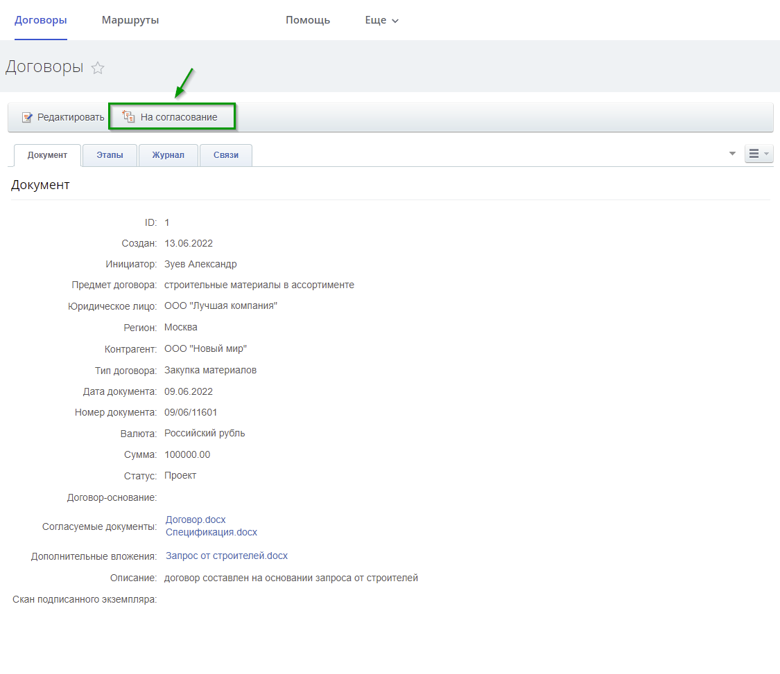 Если все данные указаны правильно, необходимо нажать кнопку Запустить согласование, и договор отправится по маршруту согласования.