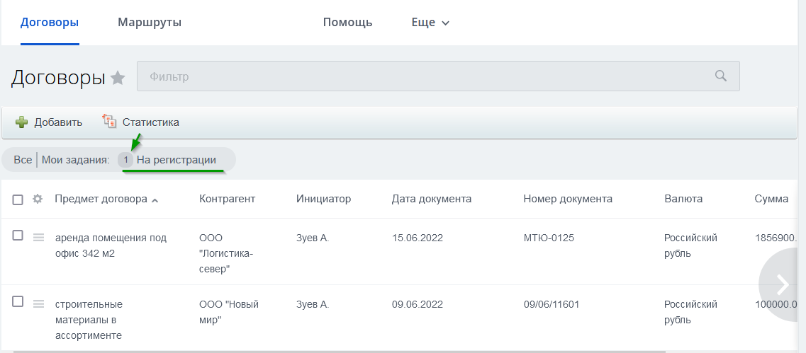 Текущие статусы в процессе регистрации отображаются во вкладке Этапы и в Карточке договора, аналогично предыдущим задачам.
